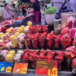 1. Try Jamón Ibérico: Jamón Ibérico, freshly sliced at the stalls, is a hallmark of Spanish culinary culture. 2. Enjoy a fresh juice: Whether it's passion fruit, mango, or strawberry, the juice is ice-cold and refreshing, making it the perfect accompaniment to a market stroll.