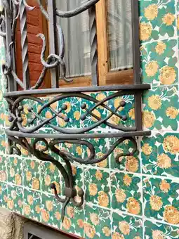 The marigold-patterned tiles and intricate iron window frames with plant designs are so exciting!
