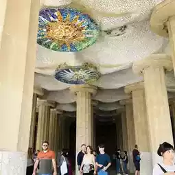 Gaudi's architectural style is characterized by curved structures and colorful tiles applied to the surface, but Park Güell also had sections that used natural stones laid out in free-form shapes. It seemed designed to blend in well with the surroundings, being eco-friendly. Haha. What's unique about this area is that the columns aren't upright, but rather tilt inward, forming an arch!