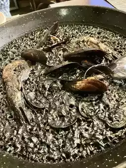 Enjoying paella in a restaurant with a retro theme. 🥘