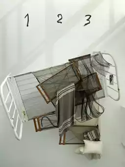 A large bed and bedding hanging on the wall at the entrance to the exhibition hall..!