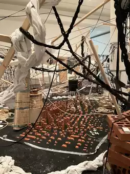 Some installations feature props that are meaningful or symbolic to the artist, arranged inward in a square shape. You can also see photos of the process and the finished product.