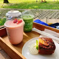 There are many seating areas, both indoor and outdoor.The menu here has a variety of dishes, both savory, sweet, and drinks. We were full, but we couldn't resist the temptation of the cake, so we ordered a piece to try.