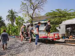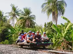 The bamboo train is a simple invention based on local wisdom. It is made by cutting bamboo to create a woven platform for seating, connecting it to a set of metal wheels, and attaching a modified boat engine. It runs along old railway tracks, transporting goods and people over short distances since the end of the civil war. Starting from the old railway station from the era when trains were thriving, it travels to villages, crossing canals and fields along the way. The moderate speed makes the journey exciting and thrilling throughout. At the destination, there are villages with souvenir shops to explore.