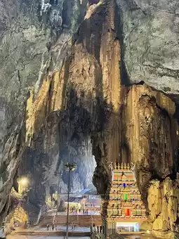 At the entrance, a towering golden statue of Lord Murugan, standing approximately 42.7 meters tall, greets visitors with its impressive presence. Behind the statue, a colorful staircase with 272 steps leads to the temple inside the cave. The cave interior exudes a mystical atmosphere, with high ceilings and natural rock walls creating a vast, awe-inspiring space.