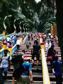Visitors climb 272 colourful steps to reach the Temple Cave, a vast cavern with high ceilings and intricate Hindu shrines. During Thaipusam, a vibrant annual Hindu festival, the site transforms into a spectacle of devotion, drawing thousands of pilgrims and tourists.