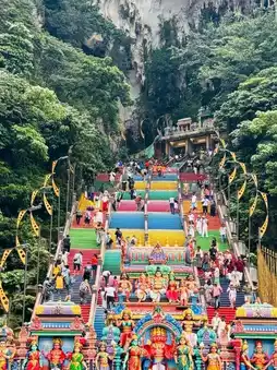 Just 13 km from Kuala Lumpur, Batu Caves is Malaysia’s most iconic Hindu shrine and natural marvel. This 400-million-year-old limestone complex wows with: