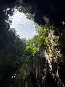 At the top of the stairs, the inside of the large cave is cool and filled with a sacred atmosphere. Temples line the cave interior, creating an otherworldly space where the prayers of worshippers and the fluttering of bats' wings intertwine. Also, the limestone cliffs and lush green scenery viewed from the cave are breathtakingly beautiful.