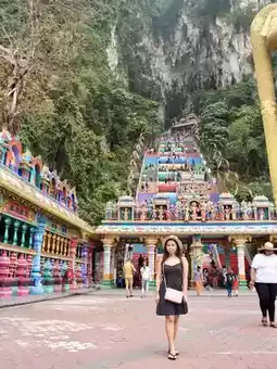 The first thing that will catch your eye? The towering golden statue of Lord Murugan, standing proudly at the entrance. And right behind it—272 colorful steps leading up to the limestone caves. It’s definitely a climb, but trust me, the views and the energy at the top are so worth it!