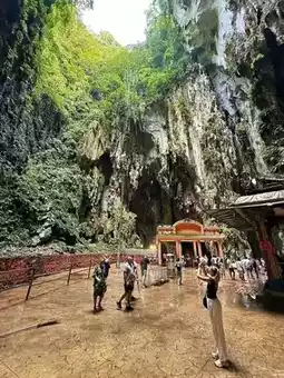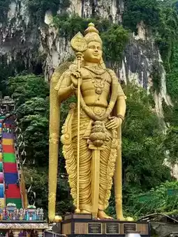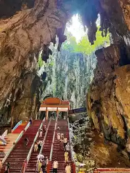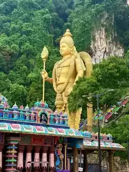 Batu Caves is a striking complex of Hindu temples and shrines set inside massive limestone caves, guarded by the colossal golden statue of Lord Murugan—one of the tallest in the world. A climb of 272 vividly painted steps leads you into the awe-inspiring main cave, where spiritual chants echo beneath natural skylights and hanging stalactites.