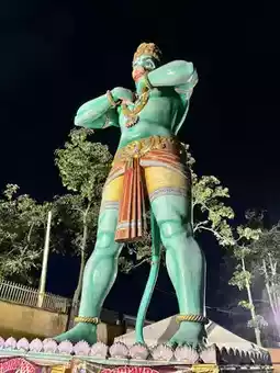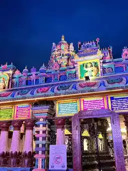 The illuminated golden Murugan statue and the colorful stairs create a magical atmosphere.