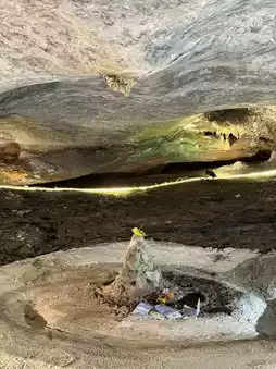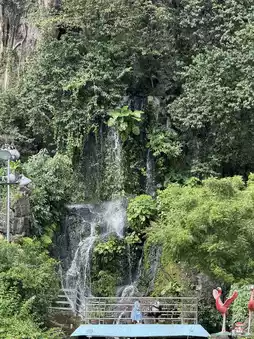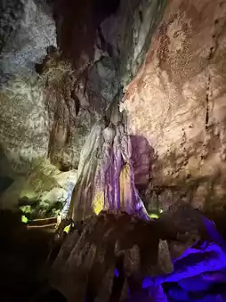 While you're distracted by the monkeys and unsure where to go, clever workers will beckon you into a cave on the left. Just to escape the animals, you follow their lead, pay 15 ringgit for entry, and find yourself in a magical cave with colorful lighting and scenes from Indian scriptures. You realize this isn't the classic cave with countless steps you remember from the guidebook. Yes, it's a different cave, but it's still interesting to see. There are also stairs, waterfalls, and it's very stuffy. This cave features crevices with stalactites and stalagmites, all illuminated.