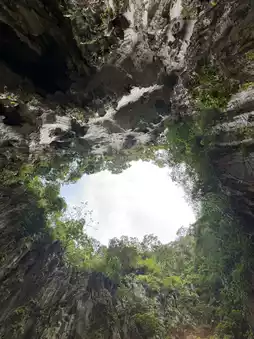 After this challenge, you enter a massive cave hall. The air is filled with the pleasant scent of incense, and there's something mysterious and magical about the place. The visit leaves you feeling light and happy. Looking back, you see how many steps you've climbed and the stunning view of Kuala Lumpur. To the left in the hall is a temple where monks pray. Straight ahead are more steps leading to a smaller hall with another temple. The most enchanting feature is the hole in the cave ceiling—when you look up, you see trees and the sky above. It's an incredible feeling.