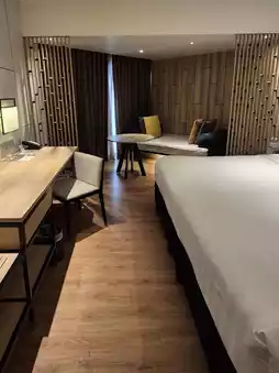 The PARKROYAL Penang Resort offers a spacious layout and abundant facilities. The lobby opens directly to the pool, and stepping outside leads you to a stunning beach with a seamless blend of sea and sky. Although it's a bit farther from the city center, transportation is still convenient. The hotel faces the main road, with restaurants and shops to the right, and a night market, McDonald's, and Starbucks to the left, making it a very convenient location.
