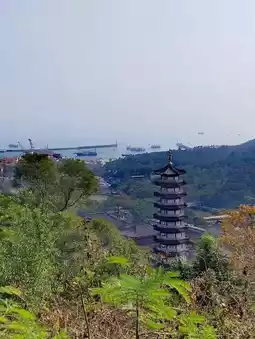 Follow the mountain path, shaded by lush trees, and breathe in the refreshing air. Along the way, you'll encounter unique, modern meteorological observation buildings. Ascend to the summit for panoramic views, where an ancient pagoda stands serenely amidst the mountains, creating a stunning tableau with the bustling harbor and vast ocean in the distance.