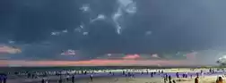 A large area of reefs🪨 where you can find small crabs🦀 hiding in the crevices. There's a red lighthouse on the left side of the beach, connected to the sea by a long boardwalk.