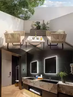 The sea-view deluxe room features 270° floor-to-ceiling windows framing Silver Beach's waves as living oil paintings. A stargazing skylight adjoins the bathtub, complemented by a custom-made Slumberland mattress and hand-dyed bedding. A tatami tea room comes with parent-child craft kits.