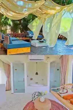 The B&B features Moroccan-inspired design with a pool, beach chairs, and swings, exuding vacation vibes and offering great photo ops!