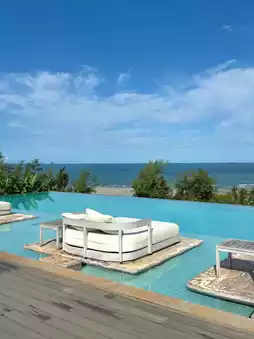 an infinity pool with a sea view, sunsets so close you could almost touch them,