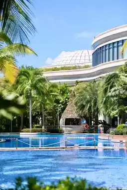 6. For leisure facilities, the outdoor heated swimming pool is truly a highlight. The pool is large and nestled within a rainforest landscape, creating a full vacation vibe. It has both deep and shallow areas, allowing both adults and children to enjoy the water fun. The fitness center's Island Fantasy Park is a paradise for kids, with slides, castles, and fun craft areas, offering plenty to play with.