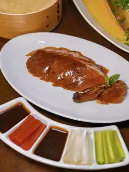 Of course we have to eat roast duck at the party~ The duck skin is crispy and oily but not greasy, the duck meat is firm and tender, rolled with duck cakes, served with onion, cucumber strips, sweet noodle sauce, delicious and authentic!