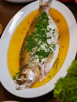 The white fish is delicate and tender, and the golden chicken juice is extremely delicious. The fish meat absorbs the freshness of the chicken juice and the fragrance of flower wine. It is tender and delicious. The steaming method can taste the original flavor of the fish meat.