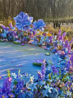 A sea of purple flowers in the snow, and colorful flower vines swaying on the branches