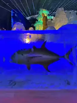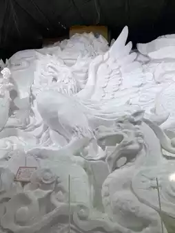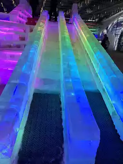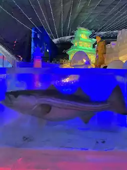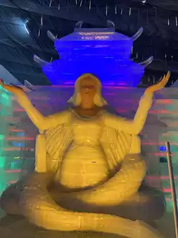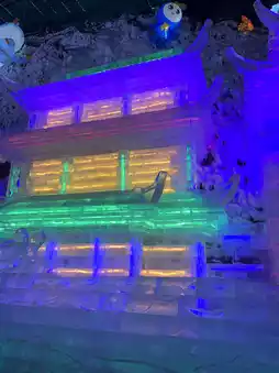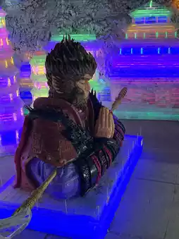 When I entered the ice lantern exhibition, I shivered from the cold, as if I had entered a freezer. There were all kinds of ice sculptures, colorful, including Nuwa and Fuwa, Vermilion Bird, maze, Nantianmen, etc. The ice palace and ice Longqing Gorge were all carved out, looking more and more like the Dragon Palace. There were two big fish frozen in two big ice blocks! An ice sculpture called "Ice Wukong" had its hands folded in front of its chest, holding a golden cudgel, with its eyes closed in deep thought, looking very lifelike, really nice! The ice waterfall was super spectacular and very beautiful.