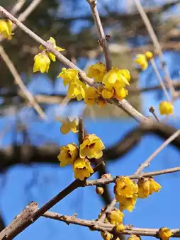 Rockery Wintersweet Close-up: Behind the rockery on the west side, shoot from a low angle looking up, with the blue sky as the backdrop, highlighting the delicate wintersweet. The ancient rockery adds to the charm.