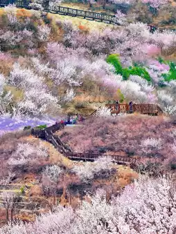 1. Panoramic View Route: After arriving at the "Xiyucun Comprehensive Management Center," the entrance to the hiking trail is directly opposite. Follow the trail upwards, and in about 20 minutes, you'll reach the pavilion at the top. From here, you can overlook the entire peach blossom valley, capturing the stunning pink sea of flowers in all its glory. Continue along the loop trail or return the way you came; the scenery in the latter half is similar to the first. This route is not too difficult, with a gentle incline and wooden walkways throughout, offering both exercise and breathtaking views.
