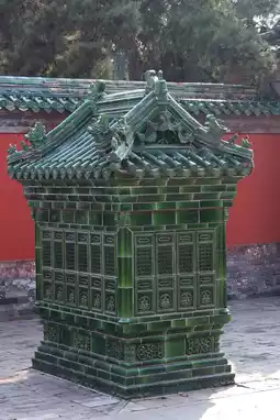 The east and west side halls of the Jingde Chongsheng Hall are black glazed tile double-eaved hip-and-gable roof buildings, each with seven bays. The memorial tablets of meritorious officials and famous generals of past dynasties are enshrined in the east and west side halls, respectively, according to the arrangement of "civil officials in the east and military officials in the west." Among the famous ministers, there are Limu and Cangjie from the Yellow Emperor era, and famous ministers and generals from past dynasties such as Xiao He, Zhuge Liang, Fang Xuanling, Fan Zhongyan, Yue Fei, and Wen Tianxiang. The last ones are Liu Ji and Yu Qian from the Ming Dynasty, totaling 79 people. All the memorial tablets of meritorious officials and famous generals are inscribed in black ink on a red background. There is a brazier to the south of each of the east and west side halls, both of which are hip-and-gable roof buildings imitating wooden structures. The west side is made of gray bricks, and the east side is made of glazed tiles. They are places where eulogies and offerings are burned during sacrifices.