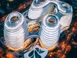 Magnificent architectural object by the British-Iraqi star architect Zaha Hadid, which impresses with its consistently curved shapes and is reminiscent of a hilly landscape.