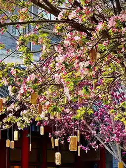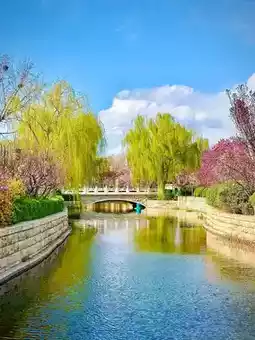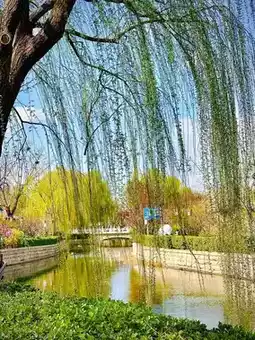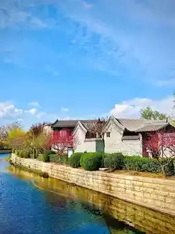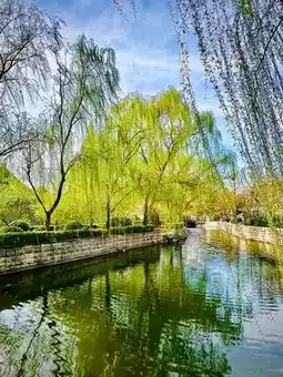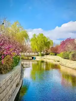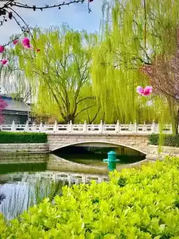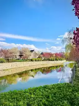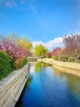 Today, both banks are adorned with green willows and colorful flowers. Peach blossoms, pink magnolias, cherry blossoms, willow trees, and the small river, with traditional courtyards along the south bank, create a stunning scene under the blue sky!