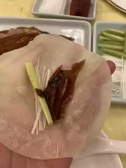 Another highlight dish that day was Peking duck, served with soft dough and a full range of side dishes. The duck skin was crispy and thin, coated with a little bit of oil from being baked until just right. When you bite into it, it was crispy, followed by the sweet and mellow taste of the sauce and fresh cucumber. It was a perfect bite that didn't need any additional seasoning.