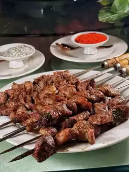 Amidst red walls and bamboo shadows, a gilded grill is set up