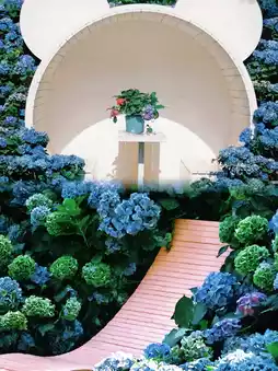 ◦ A giant hydrangea terrace at the north gate entrance, featuring pink bows🎀 and cascading floral waterfalls. Perfect for low-angle shots or overhead panoramas to highlight the blue-purple hues of 'Endless Summer'.