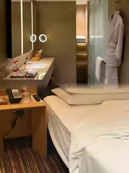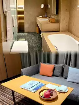 Must-book the Hutong View Suite! 🌆 Floor-to-ceiling windows frame the nighttime skyline of Wangjing SOHO🏙️, while the bed’s silk embroidery depicts "Moment in Peking"🌃—fall asleep into old Beijing dreams~ 🛌 The bathroom boasts snowstone walls + a smart tub🛀, so you can soak with CBD neon lights outside🌃. The living area includes a tea set🍵 with jasmine tea and "lüdagun" snacks—perfect for poetic Beijing-style lounging~ 📚 The AI assistant even updates you on candied hawthorn stall times! 🍡