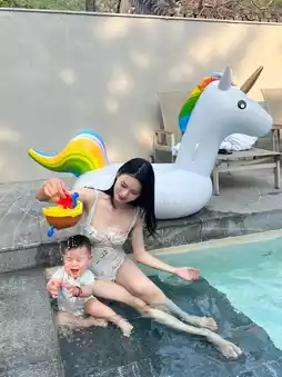 Our little one absolutely loved playing in the pool, laughing so hard their eyes squinted hhh.