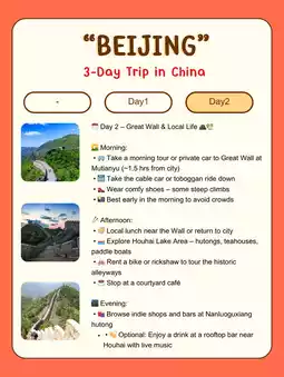 • 🚐 Take a morning tour or private car to Great Wall at Mutianyu (~1.5 hrs from city)