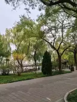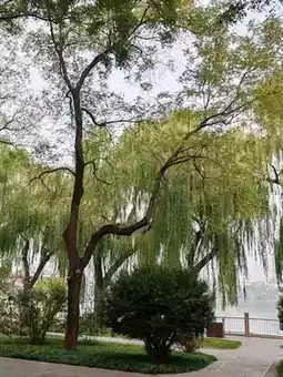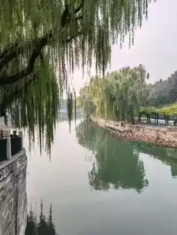 The morning light filters through the willow branches, their tender green leaves swaying gently in the breeze. Under the haze-shrouded sky, the distant white pagoda appears faintly blurred, its silhouette softened by the haze. The rising sun pierces the clouds, bathing the lake, stone bridges, and ancient trees in a warm amber glow. Along winding paths framed by weeping willows, the pagoda’s silhouette stands sacred and solemn against the haze—its reflection trembling on the water, composing a scene of serene poetry.