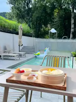 Dine 🍽️: The food was truly impressive! Breakfast is included with the room booking, and having breakfast by the pool was simply delightful 🥳. For dinner the night before, we ordered a few homestyle dishes, and the braised pork with chestnuts was absolutely amazing 👍. The kids devoured it and kept asking when we could come back 😂.