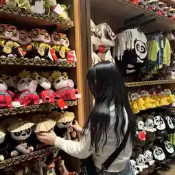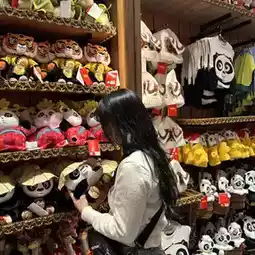The souvenir shop is full of cute merchandise, including Kung Fu Panda dolls, mugs, and even panda hats! 🐾