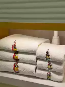 The rooms are spacious with soft, comfortable beds 🛏️, a kids' zone 🎠, a TV 📺, a minibar 🍿, and a bathroom adorned with Minion designs 🛁💛. Fully equipped with 5-star hotel amenities ✨, it's perfect for families 👨👩👧👦 or couples looking to add some themed fun to their stay 💫.