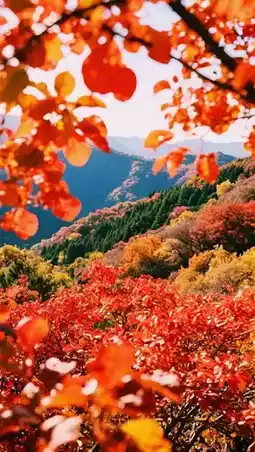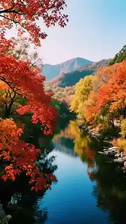 The hills are covered with layers of red maples, and the lake reflects the fiery maple leaves