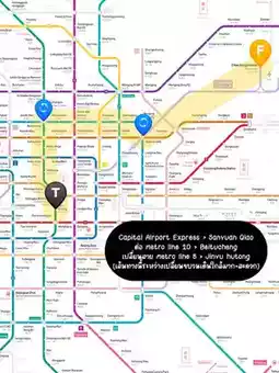 🚆 We recommend taking the 🟣Capital Airport Express > 🟣Sanyuan Qiao > 🩵Metro Line 10 Beitucheng > 🟢Line 8 Jinyu Hutong (This route has a very short transfer at the station). All have escalators.)