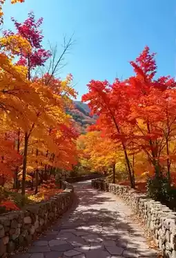 The Water Great Wall in autumn is stunningly vibrant. The trees on the mountains seem to be freely painted by nature’s artist. The fiery red maple leaves burn like flames, sparkling brilliantly under the sunlight. The golden ginkgo leaves resemble delicate little fans, dancing gently in the wind and slowly falling, as if a golden rain is pouring down. The lush green pines and cypresses stand even taller among the red and yellow autumn leaves, adding a calm undertone to this autumnal painting.