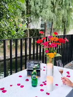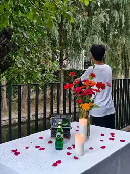 The breeze on the terrace is a pre-written love poem: white gauze drapes the table corner, candlelight flickers softly beside the bouquet, and when rose petals scatter along the table edge, the gentle pop of the bottle opening becomes the prelude to a confession. His silhouette pouring wine is cut tenderly by the leaves.