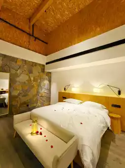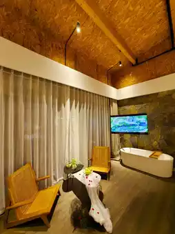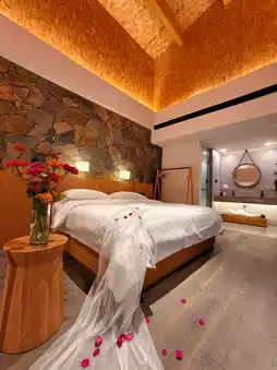 The guest room is the continuation of romance: natural stone walls catch the moonlight, and the wooden roof keeps the noise outside the mountains. The white bed is draped with a hazy veil, the TV by the bathtub plays your past moments, and even the candlestick in the corner waits for the words "I do."