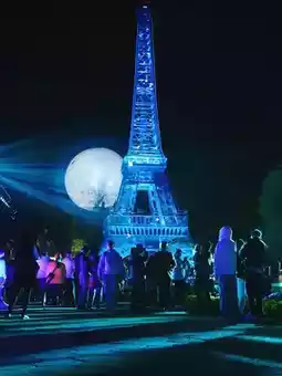 As soon as night fell, the entire park transformed! When the lights came on, the Eiffel Tower and the Pyramid sparkled, making it feel like stepping into a fairy tale world ✨.