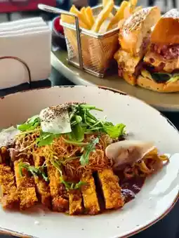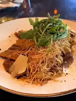 Crispy fried beef steak served with creamy truffle mushroom pasta — one of their most popular dishes.